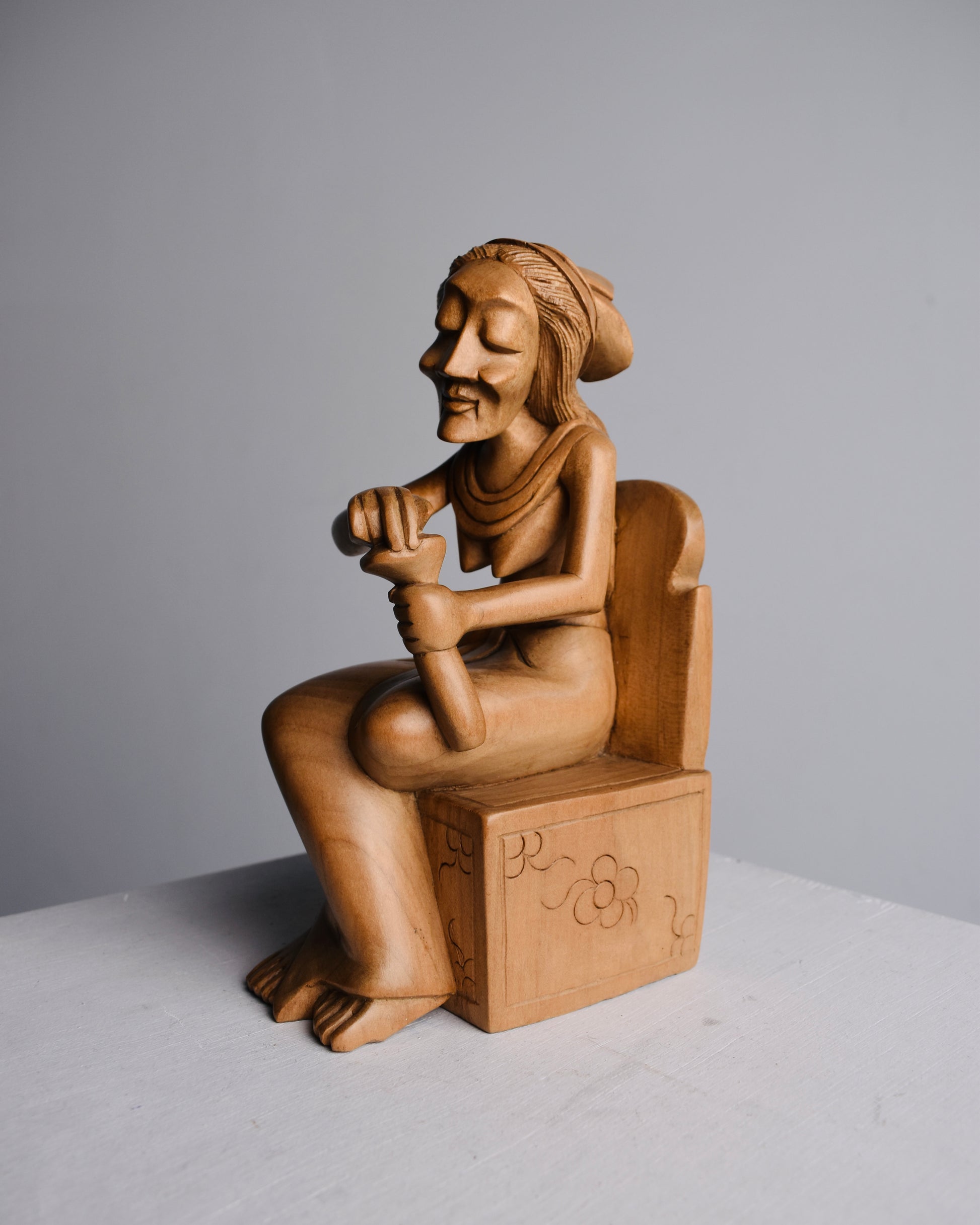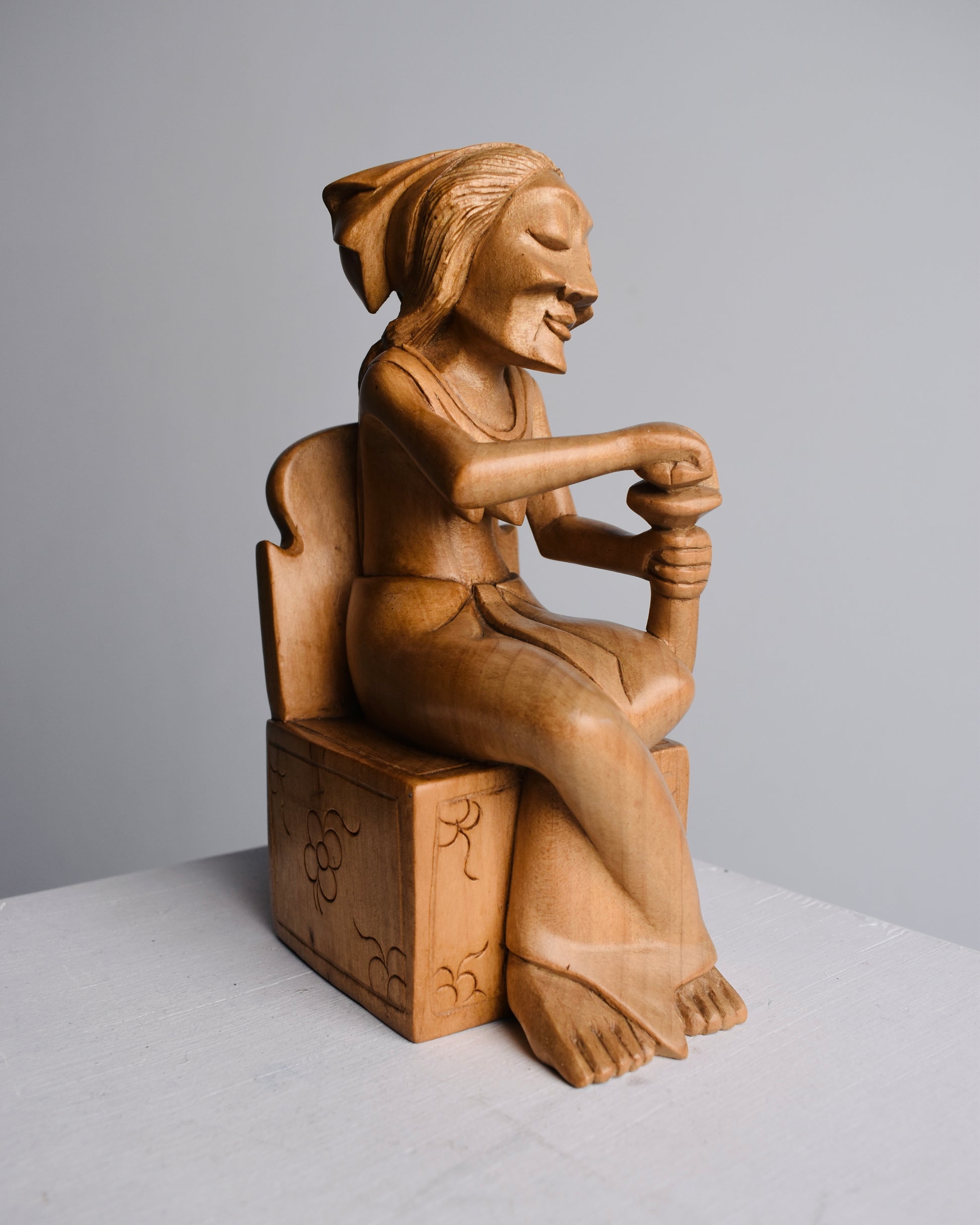 Carved from smooth, pale crocodile wood, Matriarch’s Grace captures the quiet dignity of a Balinese elder in a moment of still ritual. Seated on a delicately etched stool, she holds a mortar and pestle — a timeless symbol of nourishment, tradition, and care. Her gentle smile and flowing lines evoke a legacy of wisdom passed down through generations. This piece honours the strength of feminine ancestry and the sacred rhythms of daily life.